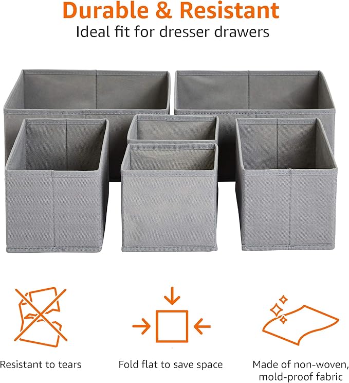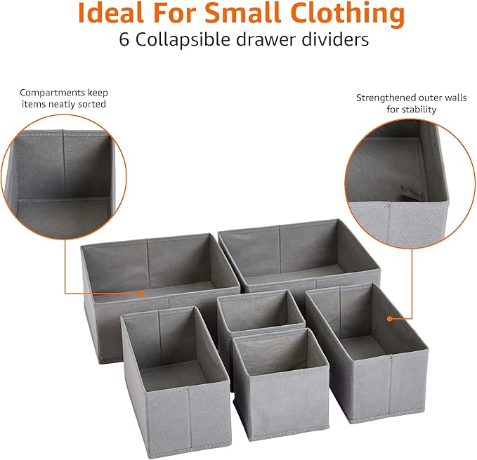 • Set of 6 Collapsible Drawer Dividers: Includes 2x small, 2x medium, and 2x large size open-top bins; made from strong yet breathable cloth.