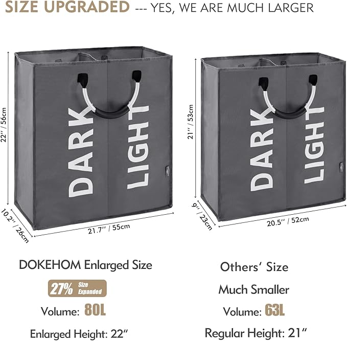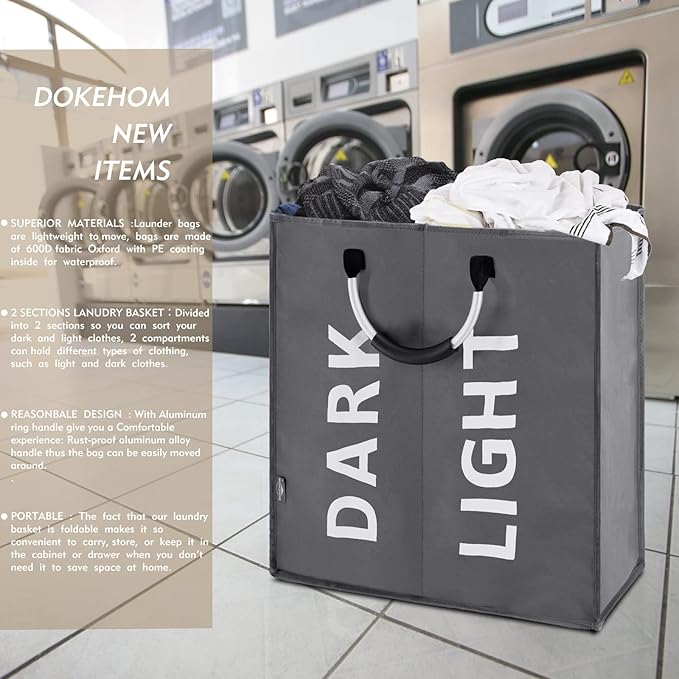 DOKEHOM 80L Large Collapsible Washing Laundry Basket Bag with 2 Sections for Bedroom, Fabric (Dark Grey).