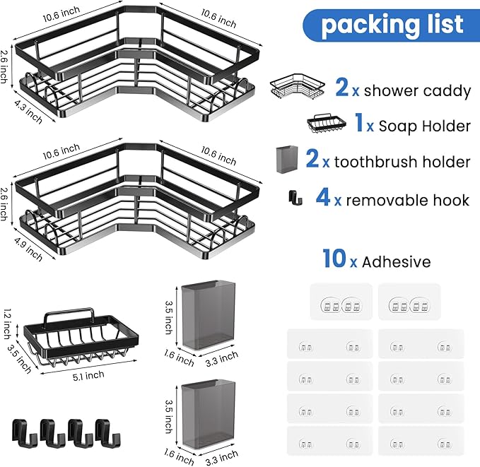 • Great Value Combination, Package included: 2 x corner shower caddy, 2 x toothbrush holders,1 x soap holder, 4 x removable hooks,10 x adhesive.These components collectively accommodate a variety of your shower necessities.If you have any questions during use, please contact us, we will solve all troubles for you.